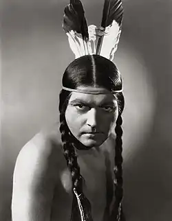 Redface is the wearing of makeup to darken or redden skin tone, or feathers, warpaint, etc. by non-Natives to impersonate a Native American, Indigenous Latin American or Indigenous Canadian person, or to in some other way perpetuate stereotypes of Indigenous peoples of Canada and the United States. It is analogous to the wearing of Blackface.[1] In the early twentieth century, it was often white performers, who wore blackface or redface when portraying Plains Indians in Hollywood Westerns.[2] In the early days of television sitcoms, "non-Native sitcom characters donned headdresses, carried tomahawks, spoke broken English, played Squanto at Thanksgiving gatherings, received 'Indian' names, danced wildly, and exhibited other examples of representations of redface".[3]