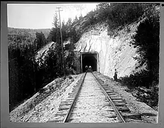 During early times, passenger trains would stop at points of interest like this one for passengers to alight and view the natural wonder. The catchment lake for the Mica Dam submerged this feature in the early 1970s, and required a track diversion, which replaced the sharp track bend known as "Calamity Curve", and added a further tunnel at a higher elevation. The water level now peaks a few feet lower than Redgrave.[5] A decade later, further realignment reduced track curvature with another diversion, added 910 metres (2,970 ft) of new track, extended the siding, and removed about 300 metres (1,000 ft) of the earliest tunnel. Previously, trains had to reduce from 56 kilometres per hour (35 mph) to 40 kilometres per hour (25 mph) on entering that tunnel.[10]