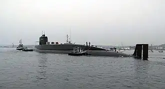 Designated Sous-marin Nucléaire Lanceur d'Engins (SNLE) literally "Missile-launching nuclear submarine", the design initially measured 128 metres (419 ft 11 in) long overall with a beam of 10.6 metres (34 ft 9 in) and a draught of 10 metres (32 ft 10 in). The submarines initially displaced 7,500 tonnes (7,400 long tons) surfaced and 9,000 tonnes (8,900 long tons) submerged.[5] This later increased to 8,000 tonnes (7,900 long tons) surfaced.[6] The submarines were powered by one pressurised water reactor providing steam to two turbines and two alternators and turning one propeller via a turbo reduction drive creating 12,100 kilowatts (16,200 hp). The submarines also sported electric emergency propulsion capable of providing a range of 5,000 nautical miles (9,300 km; 5,800 mi). The vessels could dive more than 200 metres (660 ft) and had a maximum speed of 20 knots (37 km/h; 23 mph). Each boat had two twin crews comprising 15 officers and 120 men.[7]