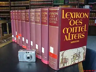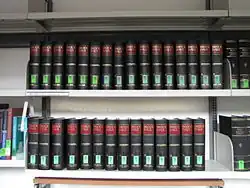 Reference works include textbooks, almanacs, atlases, bibliographies, biographical sources, catalogs such as library catalogs and art catalogs, concordances, dictionaries, directories such as business directories and telephone directories, discographies, encyclopedias, filmographies, gazetteers, glossaries, handbooks, indices such as bibliographic indices and citation indices, manuals, research guides, thesauruses, and yearbooks.[2] Reference works, while traditionally printed, are often available in electronic form and can be obtained as reference software, CD-ROMs, DVDs, or online through the Internet. Wikipedia, an online encyclopedia, is both the largest and the most-read reference work in history.[3]