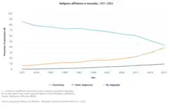 "Over the past 50 years, there has been a steady decline in the proportion of Australians who reported an affiliation with Christianity. The same period has seen a consistent rise in Other religions and No religion, particularly in the last 20 years".[32]