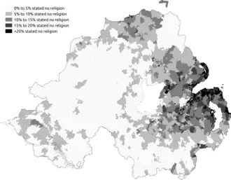 Secularisation in Northern Ireland has followed different paths within each of the two main communities, being at a more advanced stage within the mainly Protestant community in which it is reflected more often with a formal move away from the churches and by expressing no formal religious attachment, mirroring the pattern in Great Britain, whereas in the mainly Catholic community it is reflected by declining mass attendance but often with retaining a formal Catholic identification, mirroring the pattern in the Republic of Ireland.[15] Those stating that they had no religion in the 2011 census were concentrated in largely Protestant areas, suggesting that they were mostly from a Protestant background.