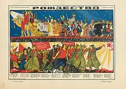 Political cartoon of Christmas 1921: clergy, imperialists and capitalists follow the Star of Bethlehem, while workers and the Red Army follow the Red Star.