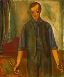 After beginning his career in France as a Realist, Auberjonois began to employ Post-Impressionist techniques after 1903.[1] His subject matter was mostly that of his native Vaud, such as natural landscapes, bathing women or rustic still lifes.[1] In the early 1930s, his paintings became progressively simpler in an Expressionist style close to that of Modigliani.[1] The personal crisis caused by the polemic over his murals is reflected in the use of fewer and darker colours after 1936.[1] Afterwards, Auberjonois realised some of his most significant works as a colourist inspired by Delacroix and then Rembrandt, including Hommage à l'Olympia (1943), Baigneuses dans la forêt (1944, Museum zu Allerheiligen, Schaffhausen), Clown et petite écuyère (1946), Portrait de l'artiste (1948, Kunsthaus Aarau), Fille dans la chambre rouge (1948, Museum zu Allerheiligen), Nature morte au crâne (1950) and L'arène jaune (1953–54).[1]