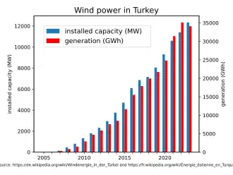 Wind power generates about 10% of Turkey's electricity, mainly in the west in the Aegean and Marmara regions, and is gradually becoming a larger share of renewable energy in the country. As of 2025, Turkey has over 13 gigawatts (GW) of wind turbines.[23] The Energy Ministry plans to have almost 30 GW by 2035, including 5 GW offshore.[24]