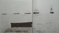 Shortly before midnight on 4 October, the ships left the port of Shinagawa in Tokyo Bay.[3] Enomoto's fleet consisted of four warships (Kaiyō maru (flagship), Kaiten maru, Banryū maru and Chiyodagata maru) and four transport ships (Kanrin maru, Shinsoku maru, Chōgei maru and Mikaho maru).[4]