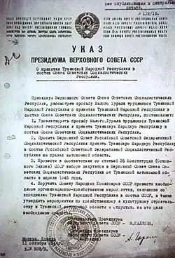 Decree of the Presidium of the Supreme Soviet on the incorporation of Tuva into the Soviet Union as an autonomous oblast, 11 October 1944. Tuva would not become an ASSR until 1961.