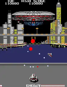 Repulse is a fixed shooter game reminiscent of Space Invaders and Phoenix, in which the player controls a laser cannon by moving it across the bottom of the screen and firing at robotic enemies and descending alien spaceships through six stages, five of which host a boss at the end that must be defeated in order to progress further.[6] The players' laser cannon is equipped with a limited force shield to endure any kind of enemy attacks, though its energy drains both while activated and whenever the ship gets hit.[6] Power-ups are dropped by ally helicopters and ships that bring to the players a faster shot than the normal one and refills the laser cannon's force field meter.[6][7] Reaching certain score thresholds by shooting at the enemies results in extra lives. Once all lives are lost, The game is over, unless the player inserts more credits into the arcade machine to continue playing.