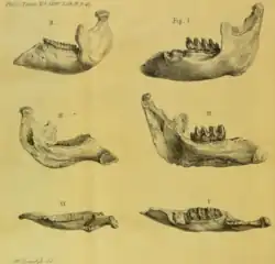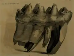 Several genera were erected for European "Mastodon" species, but most 19th century naturalists did not recognize them as distinct. In 1836, German zoologist Hermann Burmeister established the genus Gomphotherium, diagnosing it as an extinct proboscidean with tusks in both jaws, but he did not specify any species that belonged to the genus.[59] Apparently unaware of the prior genus name, Falconer and Cautley established the subgenus name Trilophodon in 1846 for some species of Mastodon. In the same journal in 1847, the species previously referred to Mastodon by Clift were transferred to Elephas by Falconer and Cautley, who also erected the subgenus name Stegodon. Falconer and Cautley also erected another species M. perimensis by 1847. They also established that the teeth assigned to a "M. minutus" were really just teeth of a young M. angustidens, effectively making the former a synonym. Falconer and Cautley also wrote that remains attributed by Cuvier to "M. Humboldtii" can instead be assigned to the other species M. Andium, turning the former species into a synonym.[56] In 1855, Auguste Aymard created the genus name Anancus for the species A. macroplus,[60] which was synonymized by French paleontologist Édouard Lartet with M. arvernensis in 1859.[61] In 1857, Falconer erected the subgenus Tetralophodon for the species M. arvernensis, M. longirostris, and M. sivalensis.[62]