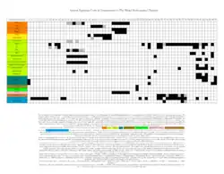 This table summarizes the content of the Rhind Papyrus by means of a concise modern paraphrase. It is based upon the two-volume exposition of the papyrus which was published by Arnold Buffum Chace in 1927, and in 1929.[4] In general, the papyrus consists of four sections: a title page, the 2/n table, a tiny "1–9/10 table", and 91 problems, or "numbers". The latter are numbered from 1 through 87 and include four mathematical items which have been designated by moderns as problems 7B, 59B, 61B, and 82B. Numbers 85–87, meanwhile, are not mathematical items forming part of the body of the document, but instead are respectively: a small phrase ending the document, a piece of "scrap-paper" used to hold the document together (having already contained unrelated writing), and a historical note which is thought to describe a time period shortly after the completion of the body of the papyrus. These three latter items are written on disparate areas of the papyrus's verso (back side), far away from the mathematical content. Chace therefore differentiates them by styling them as numbers as opposed to problems, like the other 88 numbered items.