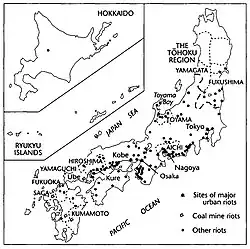 The rice riots of 1918 (Japanese: 米騒動, Hepburn: kome sōdō) were a series of popular disturbances that swept across Japan from July to September 1918. Lasting for over eight weeks, the riots were the largest, most widespread, and most violent popular uprising in modern Japanese history, ultimately leading to the collapse of the Terauchi Masatake administration. The disturbances began in the small fishing town of Uozu in Toyama Prefecture and spread to nearly 500 locations, including 49 cities, 217 towns, and 231 villages, involving an estimated one to two million participants. The riots marked a new level of labor assertiveness and were described by a Home Ministry report at the time as a "crisis in relations between Labor and Capital".[1]