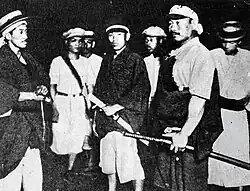 - Reservists and youth groups: Members of state-supported local organizations, such as military reservist groups (zaigō gunjin kai) and youth associations (seinen dan), were often called upon to help maintain order. However, in many cases they dragged their heels or openly joined the protests, siding with their communities against outside authorities. In Kyoto, the head of a youth association led attacks on landlords.[43] The lack of discipline among reservists was particularly alarming to government leaders, who saw it as a threat to national stability.[43]