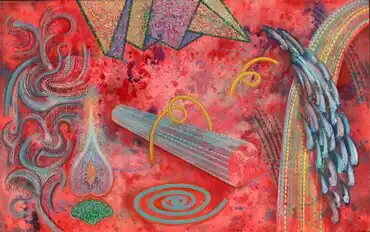 After an early-1980s trip in which Loving encountered Byzantine mosaics and frescoes, he began incorporating discrete, personalized symbols alluding to sexuality (lips, flowers, fountains, seeds, fireworks) and elemental or microcosmic life (flames, molecules, water, crystals) in his work (e.g., Amorosa Tropicalia, 1983;[50] La Source, 1986; Catalysis, 1991; or Parabola, 1993).[7][49][35][34] Critics such as Charlotte Moser wrote that these works demonstrated a romantic impulse to fix the physical properties of ephemeral sensory impressions, creating a precarious balancing act between flux and order, physics and alchemy.[7][2] Franz Schulze wrote that the symbols Introduced a surrealist quality into the work, transforming it from "a cool formalism to an ideographic fantasy, no less cool, but filled with mystery and dark ambiguities."[10]