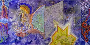 Loving's paintings of this era employed bright patterns of varied, restless line—rippling strokes, dotted lines and dashes he described as "obsessional mark-making"[7]— superimposed on richly colored, mottled color fields (e.g., Hathor's Gate Falling Right, 1977).[2][10][3] In these works, the mark served as his central technique, an indicator of time, human intention and energy, as well as a source of rhythm in his compositions.[35] Loving populated his canvasses with free-form, flat diagrammatic shapes (often with bold, electric outlines) and interior borders or portals, creating ambiguous, theatrical spaces that emphasized a contrast between diffuseness and definition (e.g., Water Connections, 1982).[5][10][49] Critic Alan Artner has related this work to Georges Seurat's, in terms of its technique and illusion of inner light, while also suggesting that it anticipated the Pattern and Decoration movement and later trends in abstraction evoking aerial, map-like associations.[1]