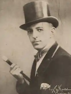 After an unsuccessful attempt to establish himself as a stage magician in British variety, he travelled to Australia, where he performed initially as Val Raymond before adopting the name Cardini.[3] His new name advertised his mastery of card manipulation and paid homage to the most famous magician of the era, Houdini.[3] Cardini wore a tuxedo, cape, top hat, and white gloves, and was billed as "The Suave Deceiver".[4]