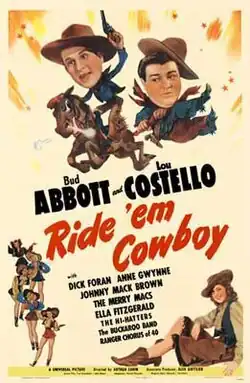 Ride 'Em Cowboy is a 1942 film starring the comedy team of Abbott and Costello, Dick Foran, Anne Gwynne, Johnny Mack Brown, Ella Fitzgerald (in her first film appearance), Samuel S. Hinds, Douglas Dumbrille, Morris Ankrum, and directed by Arthur Lubin.[2] The film focuses on Abbott and Costello as they play the role of two peanut vendors on the run from their boss. Despite their lack of knowledge in the trade, they get jobs as cowboys on a dude ranch. The film is set in the West.