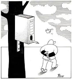 The themes of Baldišius' caricatures are diverse. The world of bureaucracy is depicted through personified desks, individuals trapped under piles of paperwork, arrows escaping from technical drawings to strike their creators, and the paradoxes of traffic signs. Professor Vytenis Rimkus observed that the artist created a uniquely distinctive caricature character—a little humanoid figure grappling with various forms of technology, such as cars, machine tools, and their components. Often, the objects of technology themselves, imbued with human-like vitality, become the protagonists of the drawings. This relationship between humans and objects creates paradoxical, illogical, and humorous situations.[5]