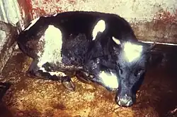 Rinderpest (also cattle plague or steppe murrain) was an infectious viral disease of cattle, domestic water buffalo, and many other species of even-toed ungulates, including gaurs, buffaloes, large antelope, deer, giraffes, wildebeests, and warthogs.[2] The disease was characterized by fever, oral erosions, diarrhea, lymphoid necrosis, and high mortality. Death rates during outbreaks were usually extremely high, approaching 100% in immunologically naïve populations.[3] Rinderpest was mainly transmitted by direct contact and by drinking contaminated water, although it could also be transmitted by air.[4]