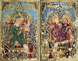 ![]() Old sage with a young prince (Ibn al-Ṣūfī and his patron-prince?), double frontispiece. Ibn al-Ṣūfī, Risālat al-Ṣūfī fī al-kawākib Probably Baghdad, c. 1225. Tehran, Reza Abbasi Museum (RAM), M. 570 | |