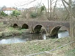 Crossing Slade Lane at a ford, the 'slade' is the Cole's black silted boggy valley, it begins a journey through the seven kilometres, between Yardley Wood and Small Heath of the Shire Country Park. Firstly passing through Scribers Lane SINC (Site of Nature Conservation Interest), a diverse site with mixed broadleaf woodland containing wet flushes and ditches, a disused millrace and a wetland scrape. Over the past few years there have been reports of Eurasian otter, water vole and water rail in this area. It runs along the River to the Scribers Lane Ford. A leat also carries water to the mill race and former mill pond of Tritterford Mill. It is bridged at Highfield Road by what was formally Titterford wain bridge built in the early 19th century but now replaced by a new bridge by which Highfield Road sweeps across the river and up the hill to Christ Church. Due to the construction of the mill pool, Chinn Brook had to be diverted far into the Dingles, flowing at a lesser gradient than the river, until it could join the Cole at the same level.[2] The river then flows through the Dingles where towards Brook Lane is Four Arches Bridge. First recorded in 1822, it formerly linked Webb and Old Brook Lanes. The wain ford alongside and the side approached have disappeared. When the North Warwickshire Line was being built between 1906/7, its embankment cut off both Webb Lane and Robin Hood Lane and to avoid the cost of two bridges so close together, a single span was placed centrally and the lanes diverted to it. Both fords then went out of use. For two decades the Four Arches Bridge continued to be used, but then Cole Valley Road was built up and thenceforward the bridge led nowhere, and it was allowed to fall into ruin until only the arch courses and piers remained. A local campaign succeeded in achieving its handsome restoration. The race to Sarehole Mill formerly went under Brook Lane in a culvert, but this has been blocked and the line of the race is lost to northward. The spillway from race to river is seen to be still there, and the slots for the removable plank weir can be seen.[2] The riverside walk continues as the John Morris Jones Walkway past the site of Robin Hood Lane ford, across Cotterills Meadow which has been Colebank Playing Field for the last ninety years until it reaches the Grade II Listed water mill, Sarehole Mill at Hall Green.[6] The Coldbath Brook, a tributary of the Cole, drives the mill which is now a museum and one of the inspirations for J. R. R. Tolkien's The Lord of the Rings. The Shire Country Park ranger office is located at Sarehole Mill.