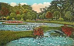 The area was identified as a 14-acre public park when the Riverside section was platted along the St. Johns River in 1869. The property contained two lakes that were spring-fed and home to numerous waterfowl. However, development did not begin until years later when the land was donated to the city. Some time after 1890, a carriage lane and walking paths were created, stone bridges were constructed, and ornamentals were planted, including camphor trees. By 1907, it was one of the prettiest parks in the southern U.S. with picture postcards capturing the beauty. Tennis courts and a bandstand were built, attracting even more people to the park's natural features. When Margaret Street was laid out, it cut off the southwest corner of the park, and the north side of the property was used by Interstate 95, reducing the parcel to its current 11.4 acres. A city-owned brick storage warehouse was constructed on the park property along College Street in 1940, which is no longer used.[3]