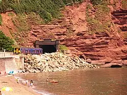 The railway passes through to Teignmouth railway station then continues through a cutting to emerge behind Teignmouth Harbour, after which the railway resumes its course alongside the water, the River Teign. The cuttings on both sides of the station were originally tunnels and were opened out between 1879 and 1884.[3] The railway passes under the Shaldon Bridge and then follows the river past the small promontories at Flow Point, Red Rock, and Summer House, opposite which can be seen the waterside inn at Coombe Cellars.