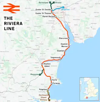 The Riviera Line is the railway between the city of Exeter, towns Dawlish and Teignmouth, and the English Riviera resorts of Torbay in Devon, England. Its tracks are shared with the Exeter to Plymouth Line along the South Devon sea wall. It is part of the Network Rail Route 12 (Reading to Penzance).[1]