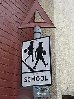 Old-style sign warning of a school ahead, still in existence at Benedict Street, Glastonbury, Somerset