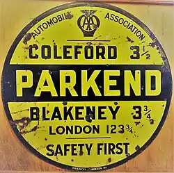 Temporary AA road sign from Parkend, in the Forest of Dean, Gloucestershire