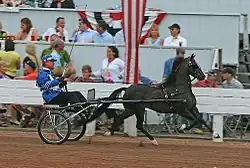Roadster is a type of driving competition for horses and ponies where the horse and exhibitor appear in equipment similar to that used in harness racing. It is derived from the historical use of certain horses hitched to light carts that traveled quickly from one place to another, often racing on ordinary dirt roads, hence the name. The term is also used to describe the horse used for such competition. Horses pull a light sulky and drivers wear racing silks.[1] However, the exhibitors do not race. Instead, they perform in an arena at horse shows at trotting gaits that include a slow jog, a medium speed "road gait," and a rapid and long-strided but controlled trot referred to as showing "at speed."[2] Animals are evaluated on performance and manners.