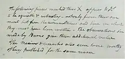 His introduction reads much like the Rules and Regulations of the Bachelors' Club in formal style.[10] A number of mock epitaphs appear in the preliminary pages of the book as well as the reverential Epitaph on my Honoured Father.[11] A number of trial pieces are present, as well as essays, self criticism, experiments in blank verse, expressions of his hopes, ambitions and some philosophising.[2]