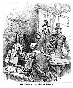 Coles was charged a third time for drunkenness in 1633, along with fellow settler John Shatswell, at Agawam. Shatswell was fined £2, but Coles was fined £10 (about US$2900 in 2022[14]) for multiple offenses: drunkenness, encouraging Shatswell's wife to drink, and "intiseing her to incontinency[a] and other misdemeanor." Coles was also sentenced "to stand with a whte sheete of pap on his back wherein a drunkard shalbe written in great letters, & stand therewith soe longe as the Court thinks meete...."[21] He was charged a fourth time in 1634, this time in Roxbury, and the court responded with more severe penalties: he was forced to wear a red letter "D" (for drunkenness) for a year and was disenfranchised (deprived of voting rights).