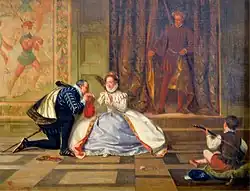 On ceremonial occasions, Dudley often acted as an unofficial consort, sometimes in the Queen's stead.[79] He largely assumed charge of court ceremonial and organised hundreds of small and large festivities.[80] From 1587 he was Lord Steward,[81] being responsible for the royal household's supply with food and other commodities. He displayed a strong sense for economising and reform in this function, which he had de facto occupied long before his official appointment.[82] The sanitary situation in the palaces was a perennial problem, and a talk with Leicester about these issues inspired John Harington to construct a water closet.[83] Leicester was a lifelong sportsman, hunting and jousting in the tiltyard, and an indefatigable tennis-player.[83] He was also the Queen's regular dancing partner.[84]