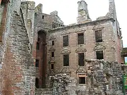 Soon after, he began work on a building project at Caerlaverock, creating a Renaissance mansion within the medieval castle walls. Known as the Nithsdale Lodging, this has been described as among "the most ambitious early classical domestic architecture in Scotland".[6] Completed in 1634, the facade bears carvings of his coat of arms (a double-headed eagle) and crest (a stag). Its original contents were detailed in an inventory made after the siege, including a drawing chamber for Lady Nithsdale furnished in cloth-of-silver.[7]