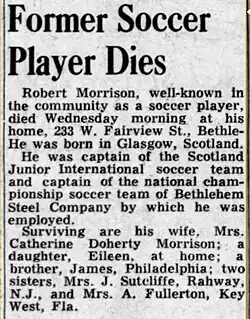 Born in Glasgow and raised in the city's Bridgeton district,[1] Morrison was a prominent player in the Scottish Junior leagues. In 1909 he moved to the United States where he joined Disston A.A. of the Philadelphia State League. Morrison and his teammates won the 1911 and 1912 league titles. Disston also went to the semifinals of the 1911 American Cup. In April 1913, Disston went to the finals of the American Cup where it fell in three games to the Paterson True Blues.[2] That fall, Morrison moved to Bethlehem Steel of the Allied American Football Association. His first game with Bethlehem took place on November 13, 1913, a 10–0 victory over the Irish-Americans.[3] Bethlehem Steel won the 1913–14 and 1914–15 league titles and the 1915 and 1916 National Challenge Cups.[4] He began the 1916–17 season as team captain,[5] but within a month rarely appeared in the lineup. According to the National Soccer Hall of Fame, he suffered a career-ending injury in 1918. He was inducted into the National Soccer Hall of Fame in 1951.[6]