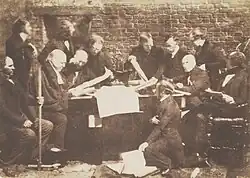 Free Church Committee. Possibly Sergeant Mackenzie, unknown man, Patrick Clason, James Crawford, William Fraser, possibly Rev. John Jeffray, W.G. Clark (kneeling) unknown man, Robert Paul, unknown man and Archibald Bonar