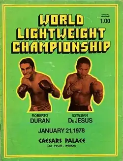 Durán would go on to successfully defend his titles seven times, while in 1976, de Jesús would claim the WBC version of the lightweight title after outpointing champion Guts Ishimatsu in his native Puerto Rico and then successfully defending his title three times. This would finally lead to a third fight between the fighters with the winner to be recognized as the undisputed lightweight champion. The fight, which was announced in December 1977 to take place on January 14, was moved back a week by promoter Don King so Durán would have more time to get in better condition.[4]