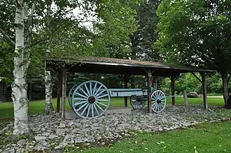 The galamander is a wagon-like conveyance, about 18 feet (5.5 m) long and 6 feet (1.8 m) wide. It has four wooden spoked wheels, the rear pair 6 feet (1.8 m) in diameter and the front ones 4 feet (1.2 m). The wheels have iron hubs and the wearing surface is also finished in iron. The "frame" of the wagon is a single large wooden beam, to which the rear axle assembly and a front swivel mount for the front axle are attached. A simple seat with a metal spring is fastened above the front axle, and a derrick consisting of a single tapered beam is attached to a swivel mount above the rear axle. The derrick was used (in conjunction with a block and tackle) to raise slabs of stone onto and off the galamander. The wagon is braked by friction pads on the rear wheels which are activated by a lever controlled by the driver. The galamander would have been drawn by a team of horses or oxen. It is presently set in a display configuration under a gable-roofed shelter in a small municipal park,[2] along with interpretive panels explaining its historical use.