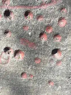 Rock cupules (/ˈkjpjl/) are artificially made depressions on rock surfaces that resemble the shape of an inverse spherical cap or dome.[1] They were made by direct percussion with hand-held hammer-stones, on vertical, sloping or horizontal rock surfaces. Cupules are widely believed to be the world's most common rock art motifs, found in huge numbers in every continent except Antarctica. They were produced in many cultures, from the Lower Paleolithic to the 20th century,[2][3] and they can be found on most lithologies. Similar artifacts from lithic Native American cultures are also known as cupstones.