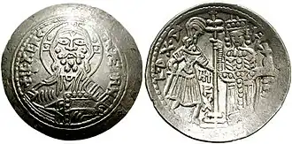 AR Scyphate Ducalis, dated year 10 (1140), after the king's victory on 25 July. Obverse: Christ. Reverse: King Roger and Duke Roger.