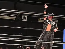 In April 1999, Yamada joined the Osaka Pro Wrestling promotion, where he began wrestling under a mask as Black Buffalo, a character inspired by the Osaka Kintetsu Buffaloes baseball team.[3] He made his debut for the promotion at its first event on April 29, where he, Dick Togo and Violencia, forming the villainous alliance Legion of Violence (LOV), were defeated in a six-man tag team main event by Masato Yakushiji, Naohiro Hoshikawa and Super Delfin.[18] Buffalo kept teaming with Togo for the rest of the year.[18][19] On November 21, Buffalo won his first title in Osaka Pro, when he defeated Super Delfin for the UWF Super Welterweight Championship, only to lose it back to him seven days later.[19] In early 2000, LOV was joined by Daio Quallt and Policeme~n, replacing Violencia.[20] On May 1, Buffalo and Togo defeated Super Delfin and Super Demekin in the finals to win the 1st Anniversary Tag Tournament.[21] In September, Buffalo took part in the inaugural Tenno-zan tournament, where he made it to the semifinals, before being eliminated by Super Delfin.[22] After Dick Togo left Osaka Pro at the end of 2000, LOV was disbanded and replaced by the new group, FLUXxx, as a member of which Buffalo formed a new tag team named Infinity with Tsubasa.[23] After reaching the semifinals of the 2001 Osaka Tag Festival,[24] Buffalo and Tsubasa defeated Super Delfin and Takehiro Murahama on July 21 to win the vacant Osaka Pro Wrestling Tag Team Championship.[25] They would lose the title to Murahama and Kaiju Zeta Mandora on August 24.[25] The following October's Tenno-zan saw a repeat of the previous year's tournament as Buffalo was eliminated in the semifinals by Super Delfin.[25] On January 27, 2002, Buffalo, Tsubasa and Gamma defeated Super Delfin, Super Demekin and Takehiro Murahama to win the Trios Cup Tournament.[26] On August 25, Buffalo and Tsubasa regained the Osaka Pro Wrestling Tag Team Championship by defeating the Kishiwada Gurentai (Big Boss MA-G-MA and Daio Quallt).[26] After a five-month reign, they would lose the title to Jyushin Thunder Liger and Takehiro Murahama on February 1, 2003.[27]