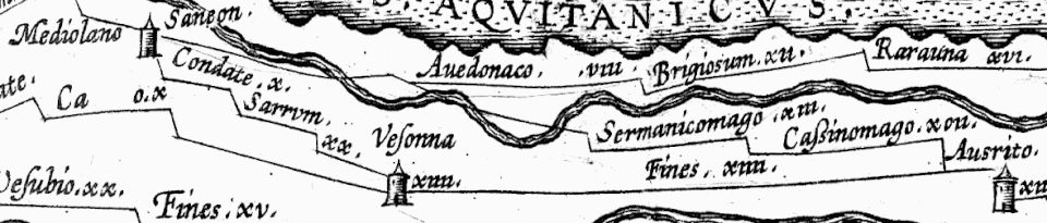Mediolano Santon.__XVI__Avedonaco__XVII__Sermanicomago__XXII__Cassinomago__XVII__Ausrito, with 1 league = 2.44 km.[18]