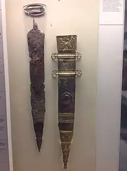 Shorter weapons (short swords and possibly sometimes daggers) were known as semispathae or half-swords. A large 3rd-century hoard from Künzing included one triangular-bladed short sword and several narrow-bladed short swords (with 23–39 cm blades). Bishop and Coulston suggest that some or all were made from broken spathae.[9][10]