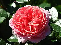 The rose is described as a very double apricot flower. It has an old fashioned, quartered bloom form with up to 100 petals, and a light, spicy fragrance.[1][4] The colour is weather dependent, reaching from deep orange to soft pink. The buds open slowly to medium-sized flowers with a diameter of 8 to 10 centimetres (3.1 to 3.9 in), are well suited as cut flowers and appear abundantly in flushes throughout the season.[6]