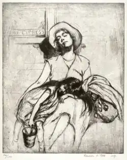 Throughout her career she made portraits, landscapes and seascapes, figure studies, genre paintings, and still lifes. In 1941 a critic said it was the portraits that had made her famous.[1] In 1938 the New York Times critic, Howard Devree, said that Osk's prints were outstanding.[17] A series of four etchings called, "Hands," was widely admired. When shown in 1937 Devree called them "arresting."[18] When shown again in 1941, the Times critic, Ada Rainy, said they were effective in their characterization,[1] and one of them ("The Sailor," shown at left) was included in the book, American Prize Prints of the Twentieth Century.[19][note 5] In her 1941 article on Osk's etchings, Ada Rainey, called "Little Old Lady" (shown at right) "a fine characterization."[1] In 1942 Rainey described a drypoint, "The Sisters" (shown at left), as "done with understanding of the value of strength of line and the structure of the figures."[20] In 1953 the Times critic, Leslie Judd Portner, wrote that Osk's drypoint, "Six O'Clock" (shown at right) was "completely realistic."[21] As well as paintings, etchings, and drypoints, Osk made aquatints and etched relief prints in the late 1940s.[1]