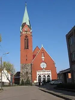 The Protestant church was built in Rosenau, a quarter of southern Königsberg, Germany. Land for the new church was donated by the final owners of the estate Rosenau, the Schulte-Heuthaus family. Construction began on 23 July 1914, but was halted due to the outbreak of World War I. It was finally completed from 2 April 1925 to 12 December 1926. The Neo-Gothic church included material from dismantled sections of the Königsberg fortifications.
