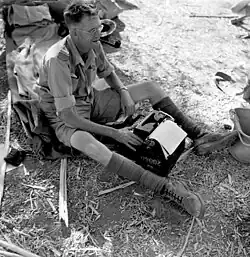 Canadian Press war correspondent Ross Munro typing a story in the battle area between Valguarnera and Leonforte, Italy, August 1943