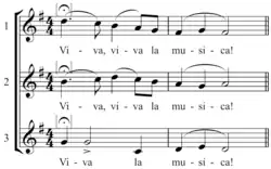 A round (also called a perpetual canon [canon perpetuus], round about or infinite canon) is a musical composition, a limited type of canon, in which multiple voices sing exactly the same melody, but with each voice beginning at different times so that different parts of the melody coincide in the different voices, but nevertheless fit harmoniously together.[2] It is one of the easiest forms of part singing, as only one line of melody need be learned by all singers, and is part of a popular musical tradition. They were particularly favoured in glee clubs, which combined amateur singing with regular drinking.[3] The earliest known rounds date from 12th-century Europe. One characteristic of rounds is that, "there is no fixed ending", in the sense that they may be repeated as many times as possible, although many do have "fixed" endings, often indicated by a fermata.[1]