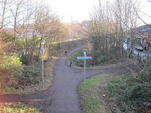 Rowntree Halt was a minor unstaffed railway stop on the Foss Islands branch line in York. Located on the southern edge of the Rowntree's chocolate factory, Rowntree Halt was opened in 1927 by the London and North Eastern Railway to provide a low-volume, not publicly advertised passenger service to the Rowntree factory for workers commuting from areas south of York such as Selby and Doncaster. The halt itself was little more than a single short platform located a few yards west of a signal-protected siding that allowed freight directly into the factory complex. Passenger services ceased in 1988, and the station was officially closed on 8 July 1988.[1][2] The line was dismantled and turned into a cycle track.