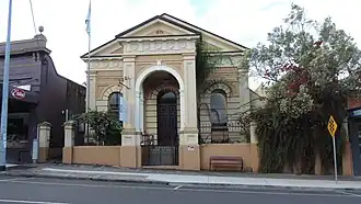 The rendered masonry front fence forms a plinth to the building which is set back from the property boundary and raised above street level. The compact front elevation is dominated by a projecting pedimented portico which is framed by fluted corner pilasters and shelters a set of concrete stairs and a landing. The plain moulded pediments of the front elevation and portico rest on decorative entablature friezes. The portico pediment has 1892 inscribed within. The front elevation is defined by fluted corner pilasters and composed of three arched openings notable for their severe rendered rusticated surrounds. The central arched entrance accommodates a narrow draft lobby which projects into the banking chamber. The lobby is lined with timber panelling and houses two sets of doors, the outer a set of solid timber panelled doors and the inner a set glazed timber doors. The flanking arched openings house timber framed double hung sash windows with masonry sills.[1]